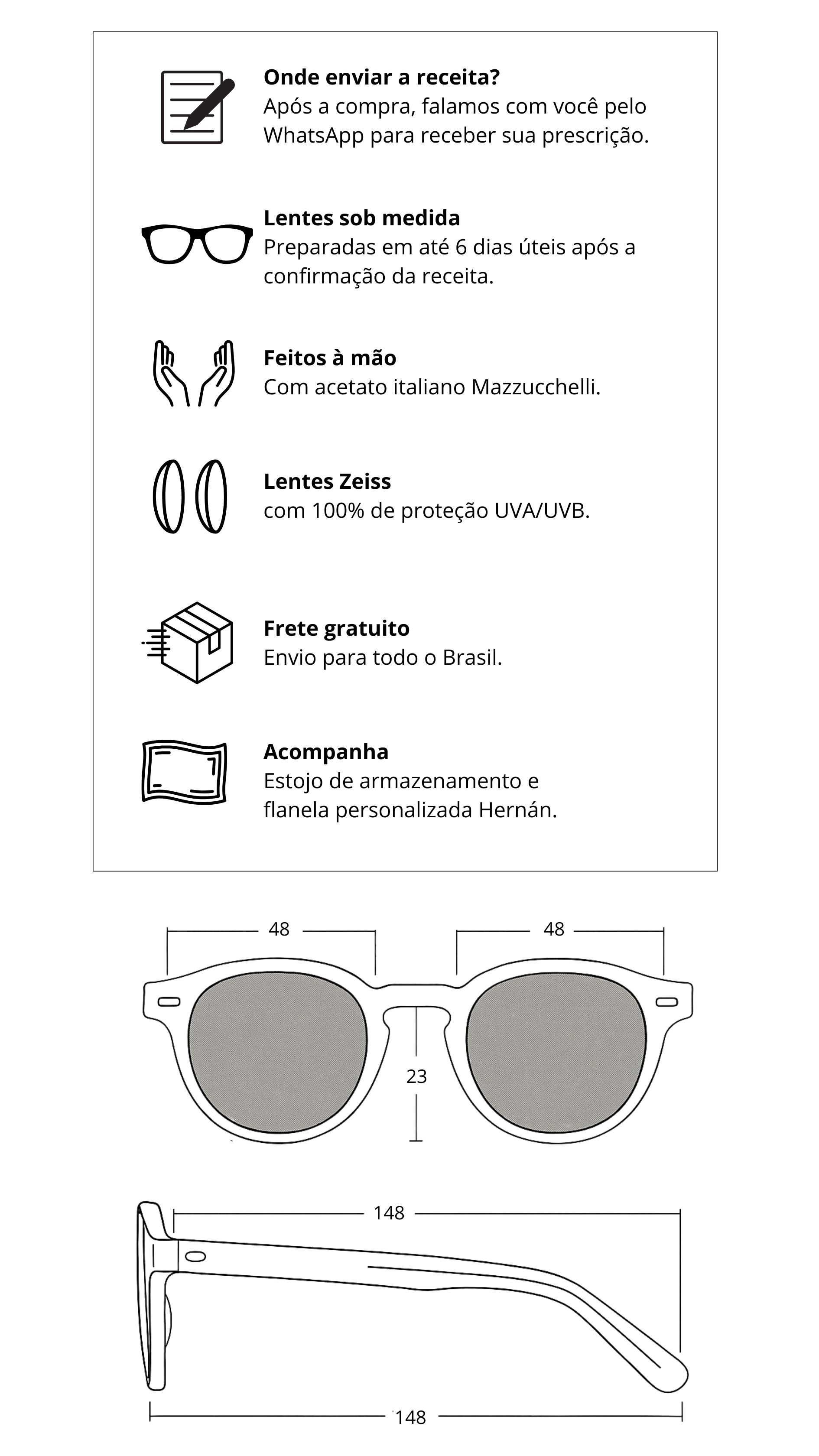 Lentes: Este modelo acompanha lentes sem grau, mas caso queira fazer conosco as suas lentes com grau, entrar em contato com nosso whatsapp.