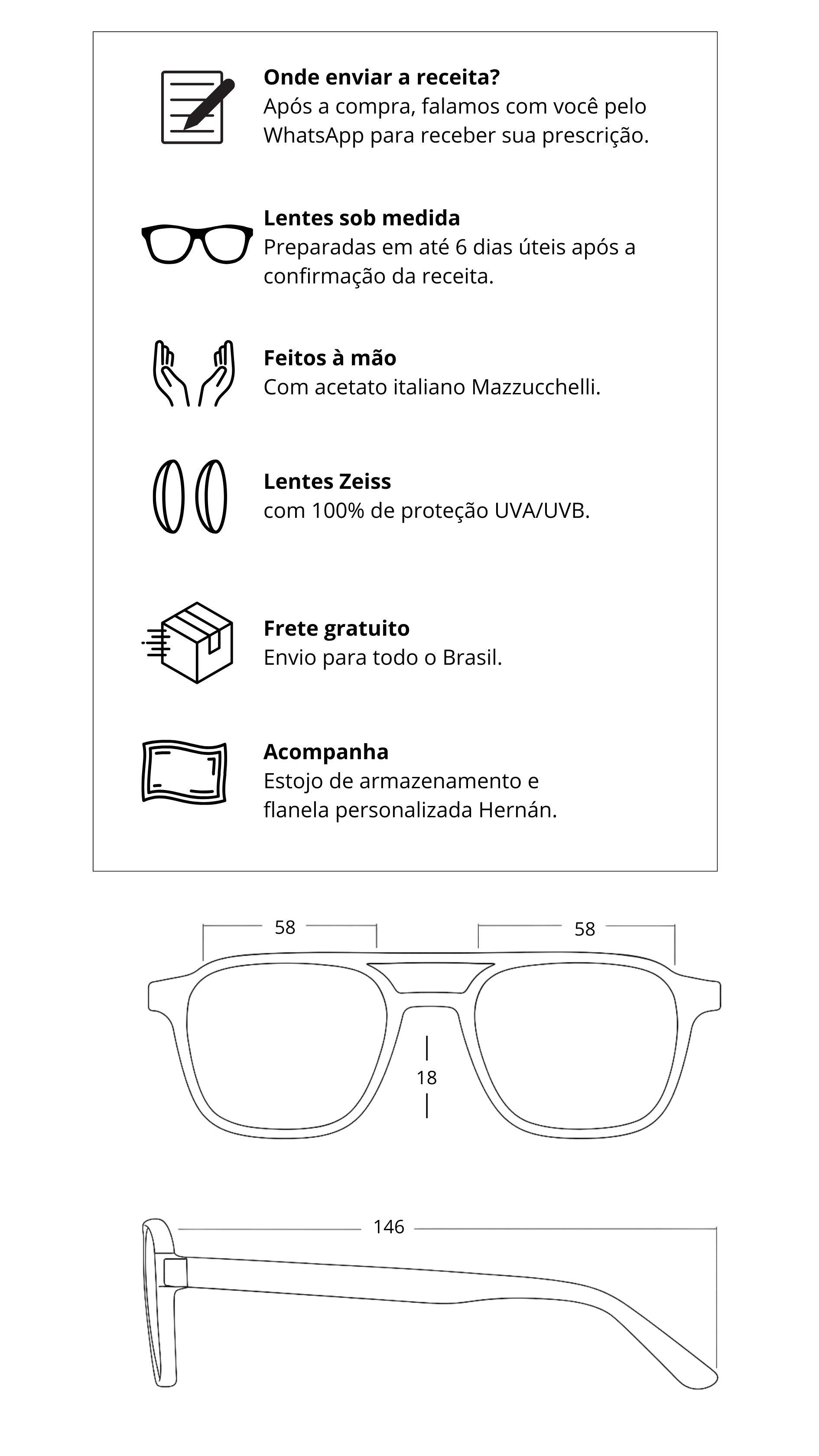 Lentes: Este modelo acompanha lentes sem grau, mas caso queira fazer conosco as suas lentes com grau, entrar em contato com nosso whatsapp.