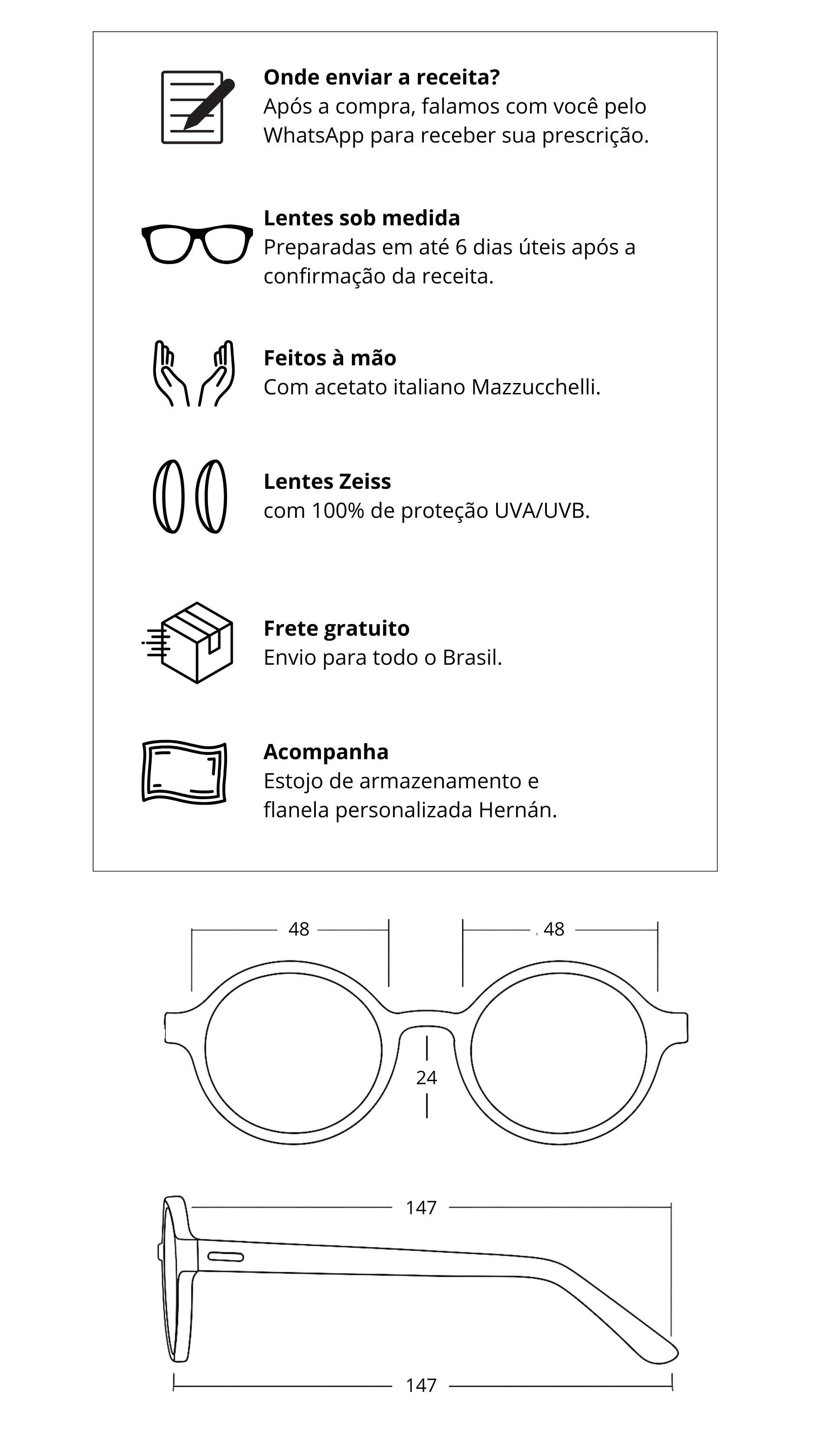 Tipo de Acabamento: Tortoise clássico com nuances equilibradas que reforçam o design atemporal característico da Hernán.