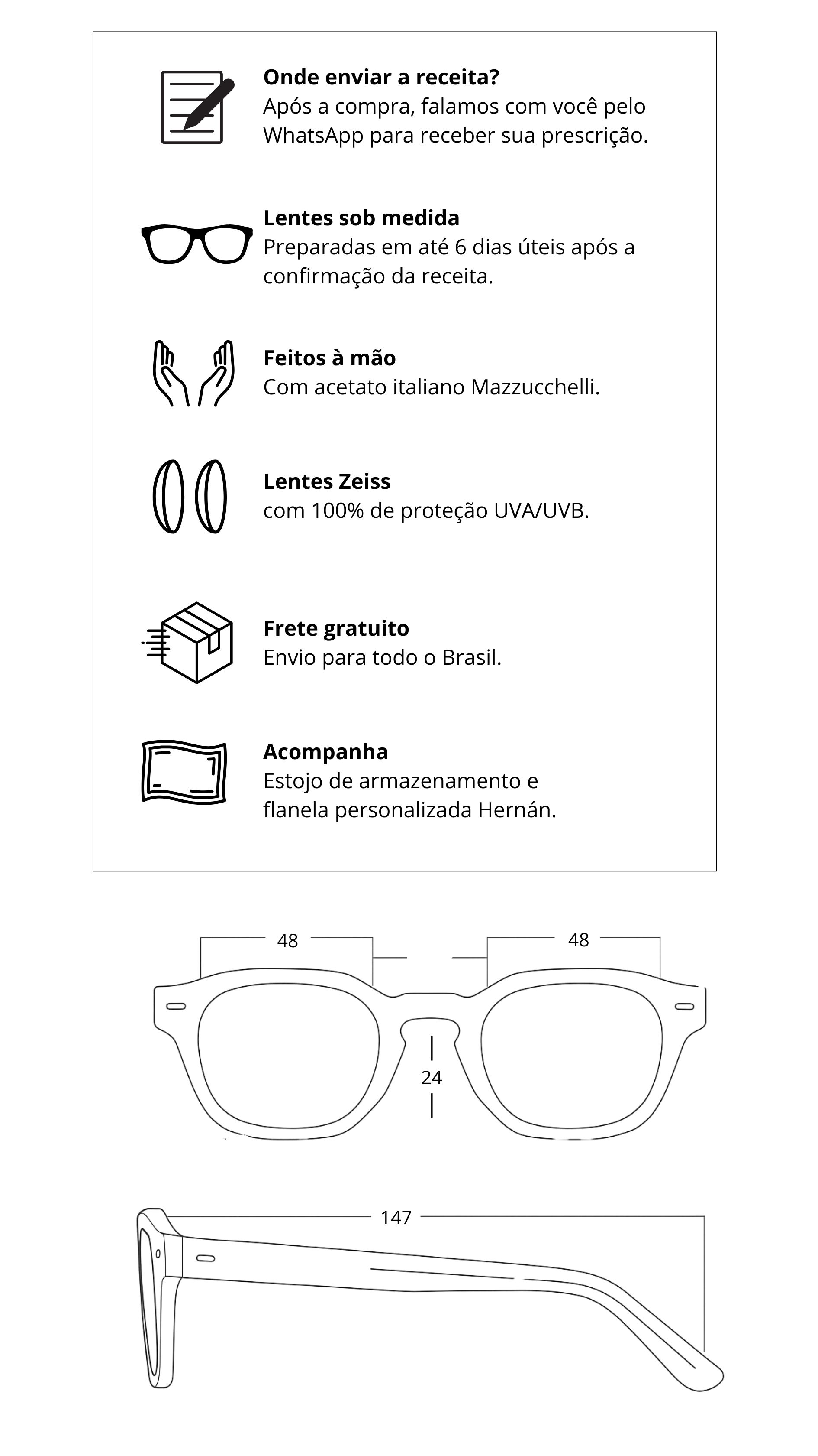 Material da Armação: Acetato Mazzucchelli de alta densidade, trabalhado artesanalmente e polido à mão.